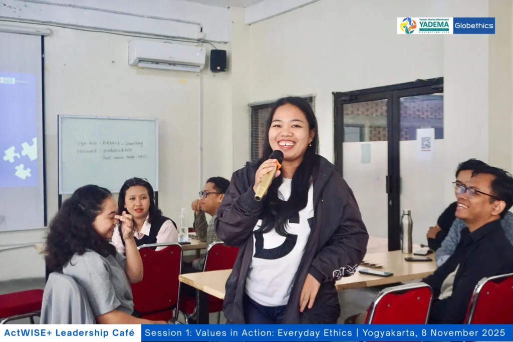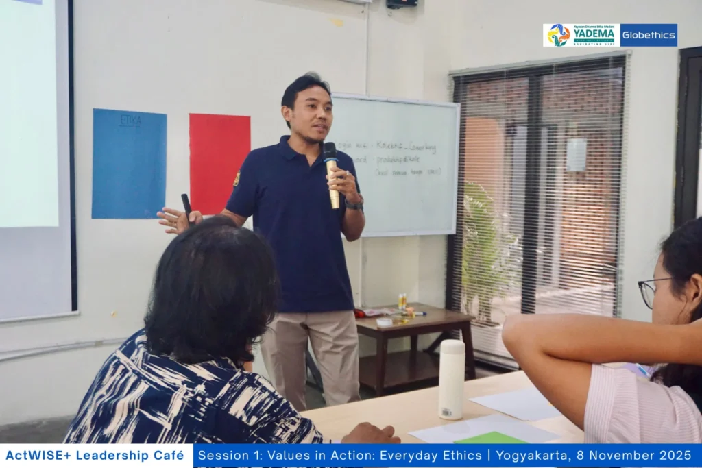 Pada aktivitas pertama, para perwakilan komunitas muda diajak mengekplorasi perbedaan nilai, moral, etika, dan etiket. Mereka juga mendiskusikan berbagai dilema etis yang sering dihadapi, baik dalam komunitas maupun kehidupan sehari-hari. Beberapa pertanyaan reflektif pun muncul, seperti: lebih baik jujur tapi tidak disukai, atau disukai tapi tidak jujur?